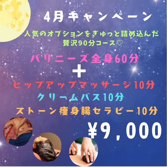 人気のオリジナルバリニーズに、密かに人気なヒップアップマッサージとクリームバスとストーン痩身腸セラピーのオプション3つを組め合わせた4月限りの内容です♪